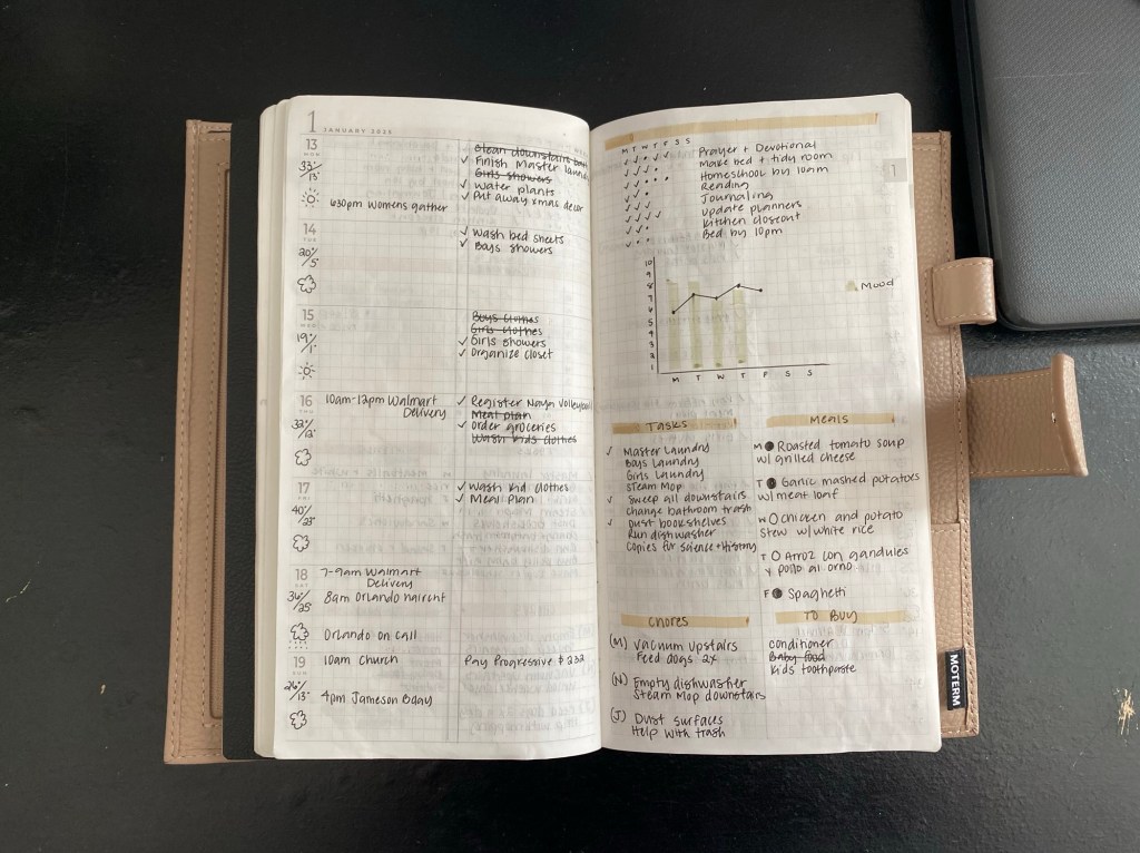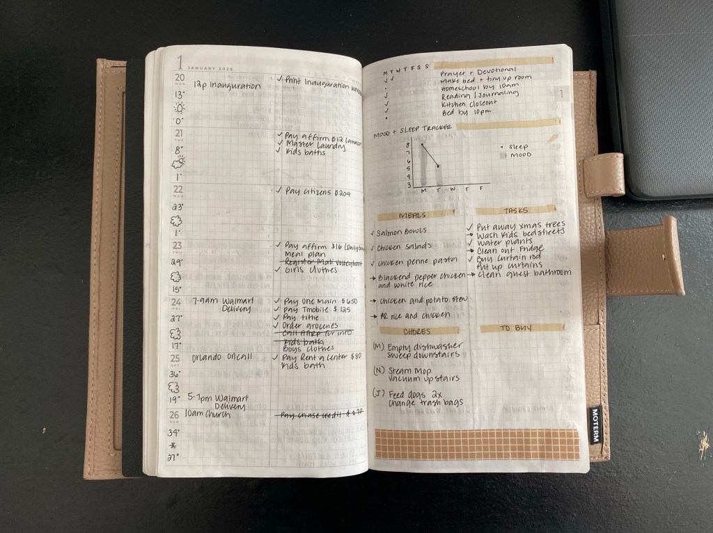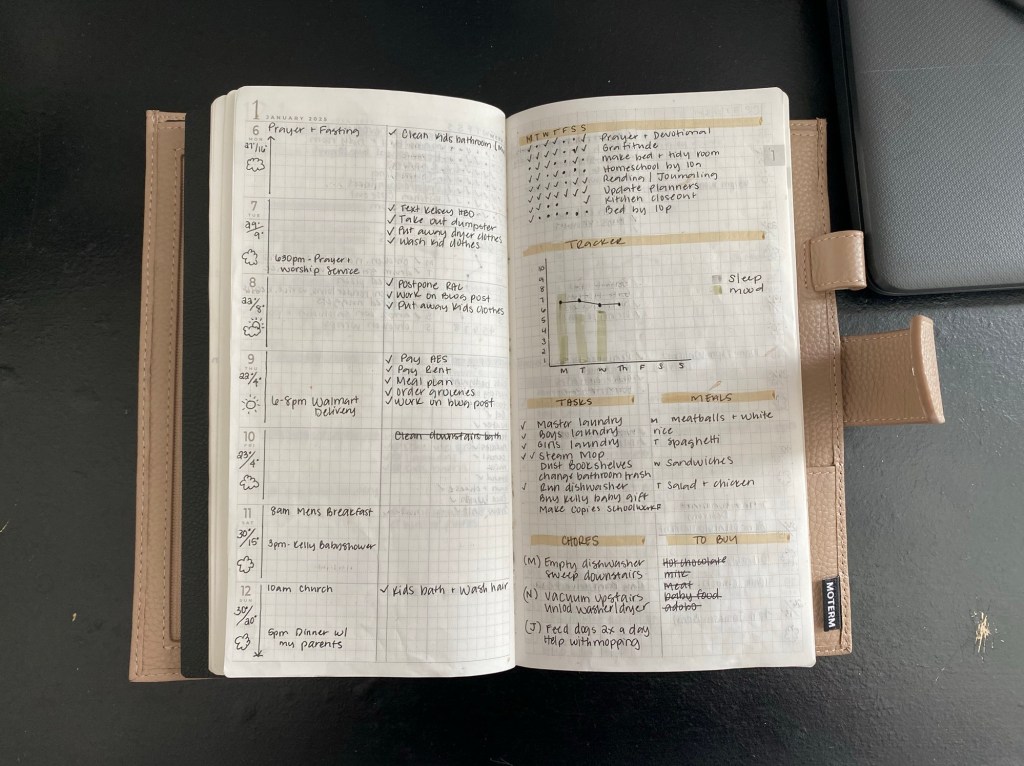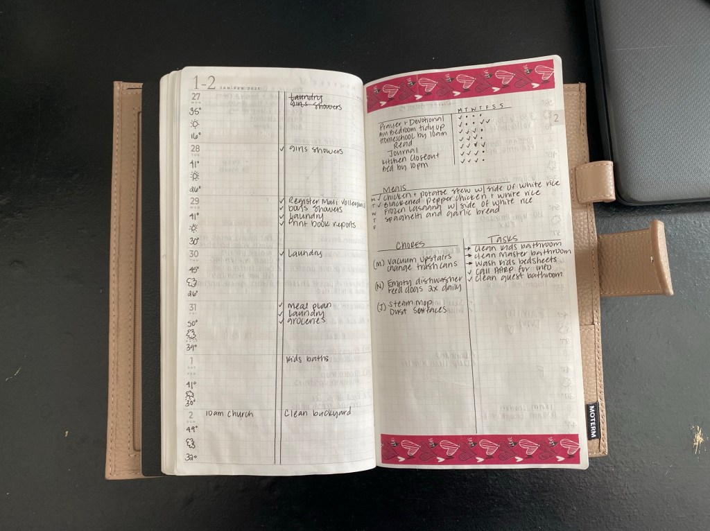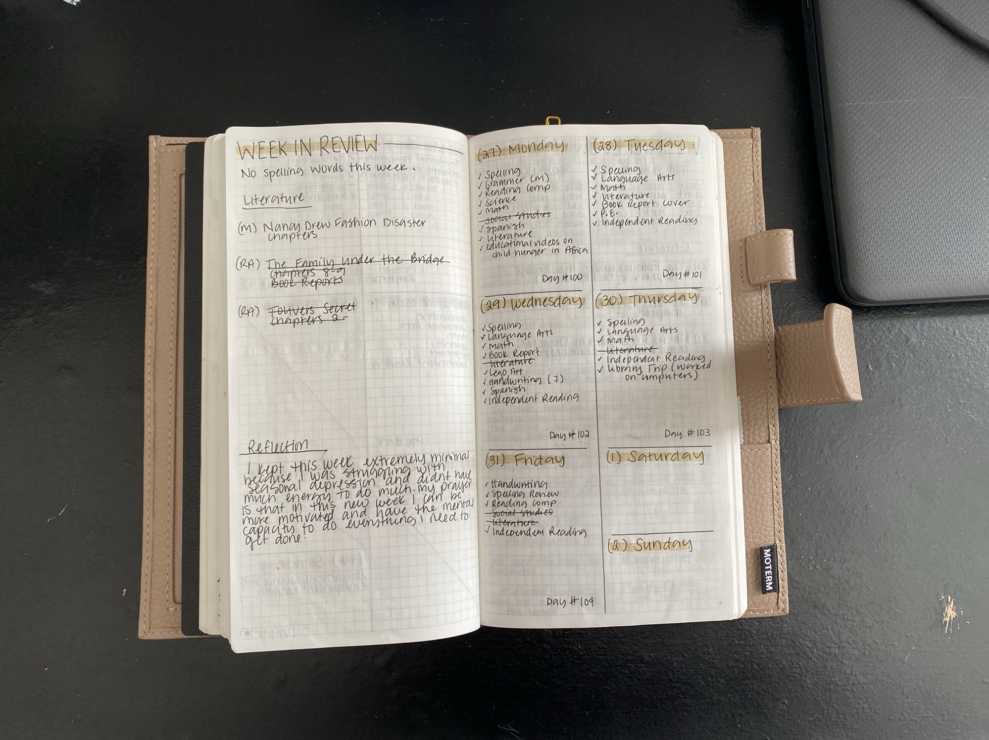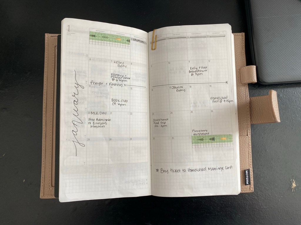 For the monthly spread, there’s nothing really special about it. I use it for what it is: a monthly overview of dates and events. I’m not much of a decorator when it comes to planners, so this page is pretty minimal. I had started the month with highlighting the first week for what would be our homeschool vacation annnndddd, I did not like how it looked. But it is what it is, we’re learning how to use this puppy, so mistakes are gonna happen. Other than the highlight, I very much enjoy the simplicity of this spread.