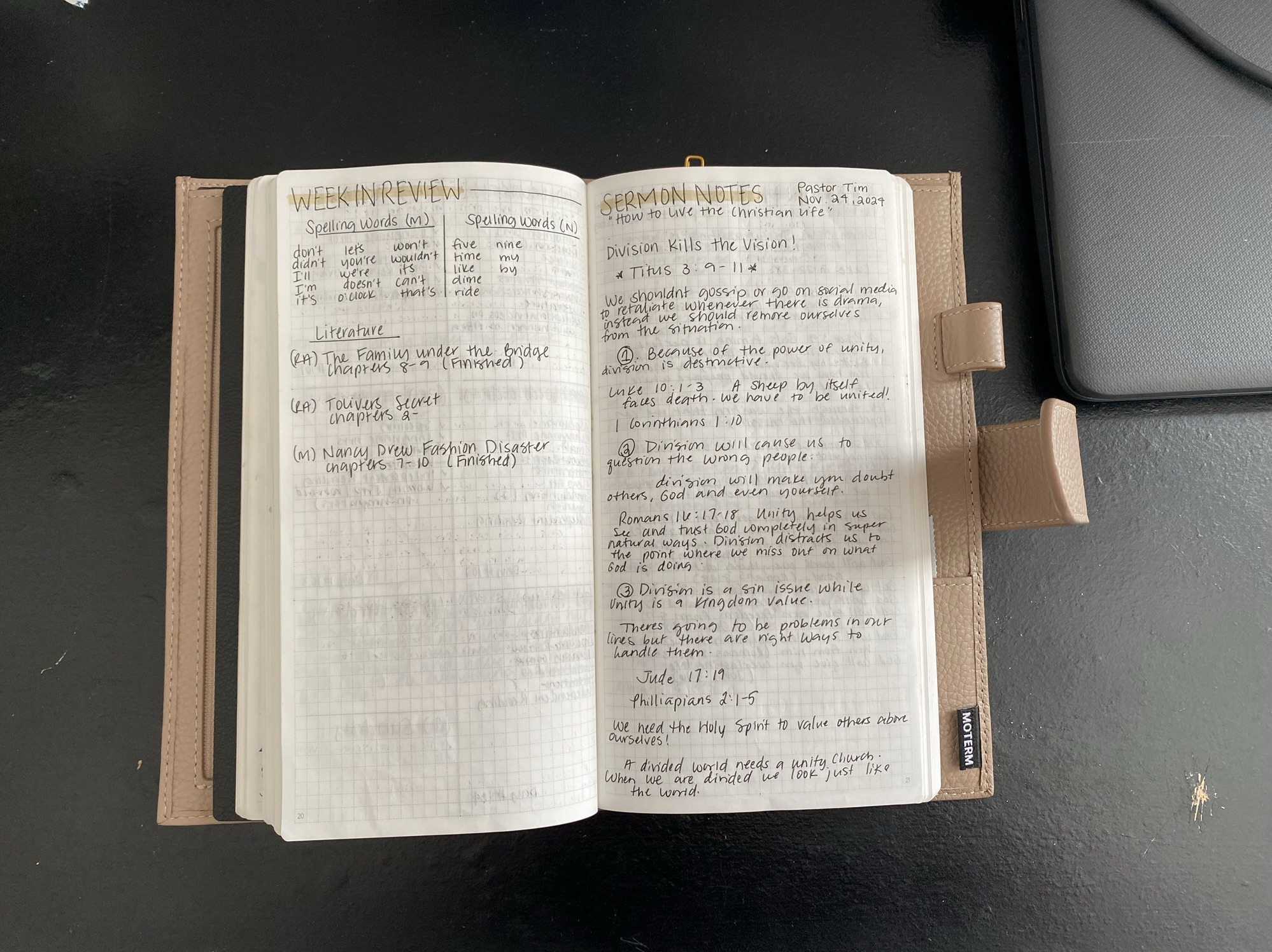 The final pages consist of what would be my “commonplace” section. Here you’re going to find sermon notes and morning pages. I battled with the decision to do my meal planning here, but thats typically my “messy” planning and I was too scared to meal plan in this section. So other than homeschool tracking, sermon notes and morning pages, I didn’t really use this section as much as I hoped for.